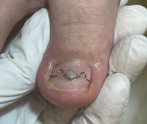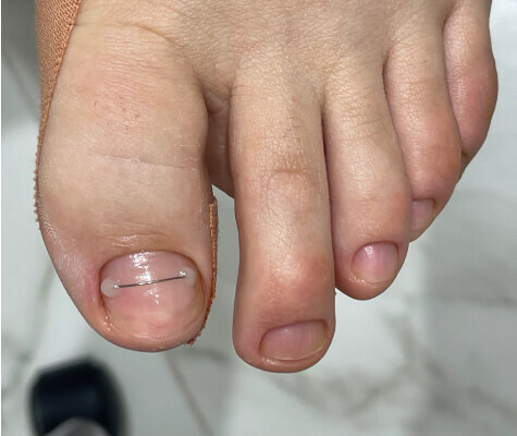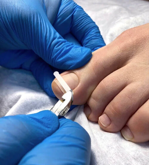 Применение в лечении ортониксических систем позволяет скорректировать направление роста ногтя, тем самым купировав врастание. Корректирующие пластины подбираются каждому пациенту строго в индивидуальном порядке с учетом особенностей деформации ногтевой пластины.