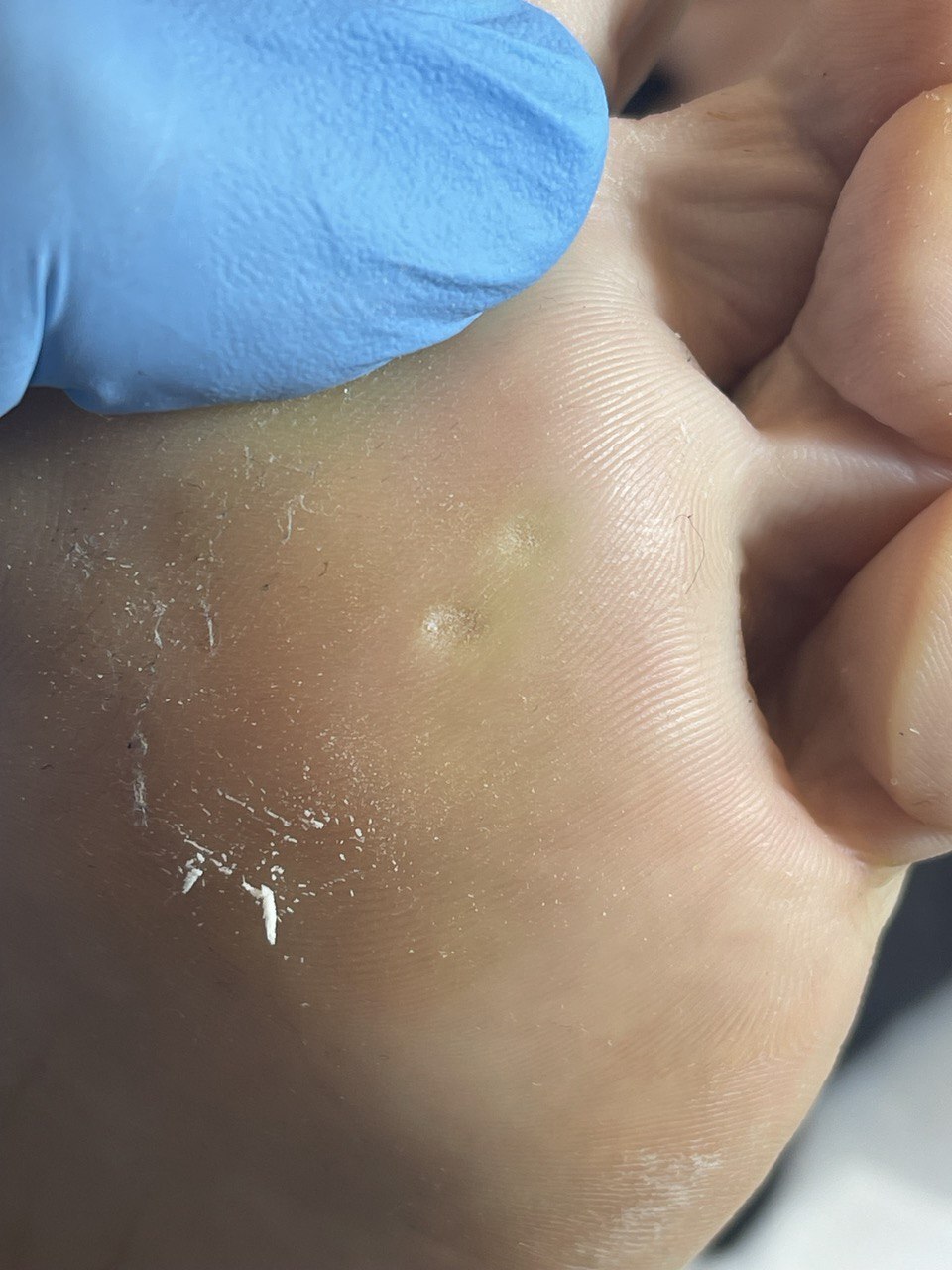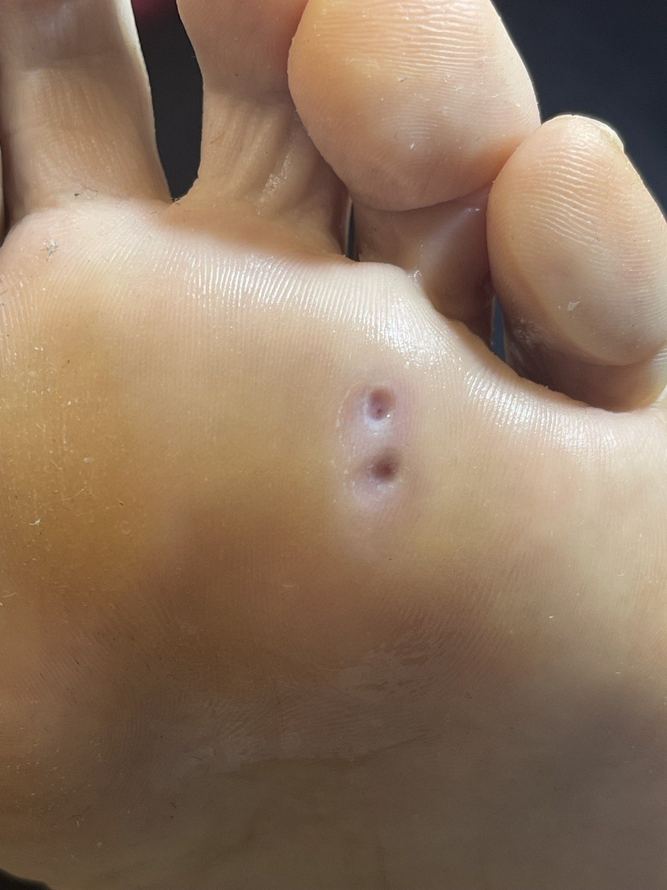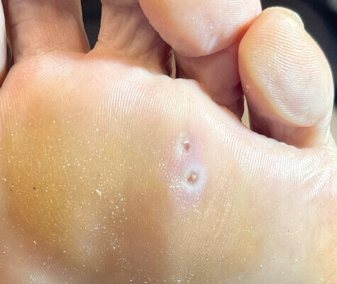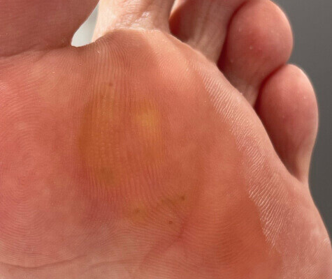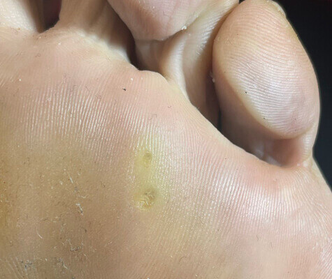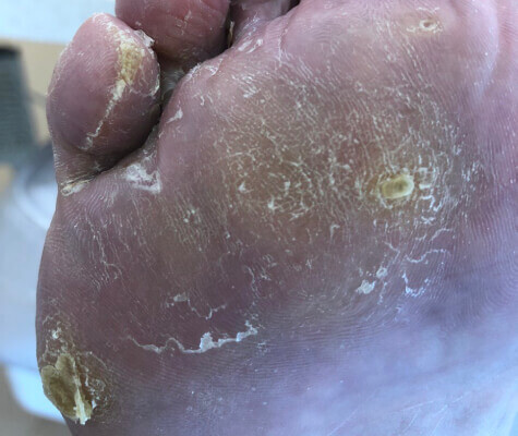 Появление трещин, язвочек, пятен, уплотнений или новообразований на стопе